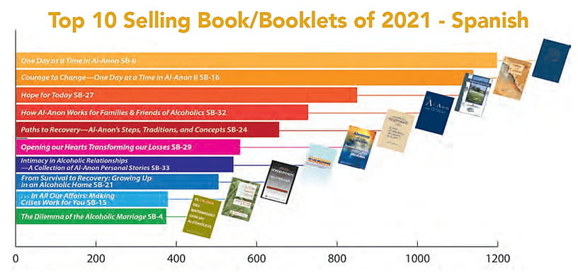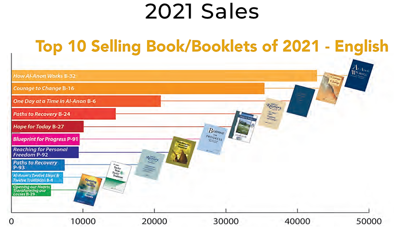 A few weeks ago I recently received my hardcopy of the new “2022 World Service Conference Summary” (item # P-46). Pasted below are images from pages 80-81 that show some stats for 2021’s best selling Al-Anon books, booklets, and the “Al-Anon Faces Alcoholism 2021” (item # N/A) outreach magazine. It’s surprising that the book “Intimacy in Alcoholic Relationships” (item # B-33) is still on the Spanish & French lists, but hasn’t been on the English one since 2019’s list of best sellers. I’m also happy to see that “Alateen-a day at a time” (item # B-10) is still showing up in the French sales! 🙌 As far as the AFA 2021 outreach magazine, it looks like the Covid-19 pandemic still affected sales of the hardcopies 😷 but the number of downloads actually increased! 😃(footnote 1)